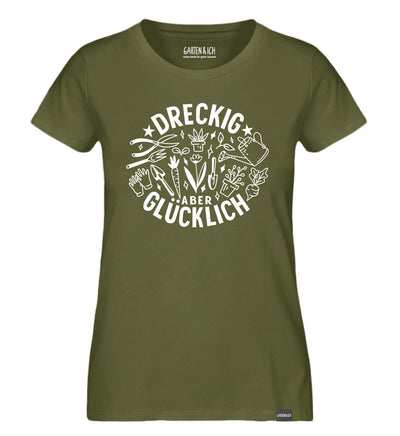 Olivgrünes Damen T-Shirt mit Aufdruck ‚Dreckig aber glücklich‘ aus 100 % Bio-Baumwolle – ideal für Gärtnerinnen, nachhaltig & bequem.