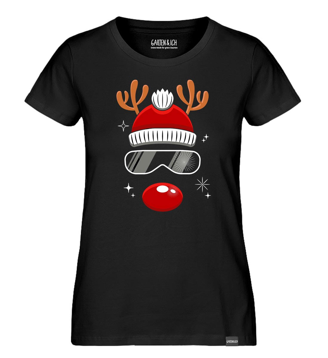 Dieses humorvolle Weihnachts-Shirt bringt sofort Winterstimmung: Ein Rentier mit roter Nase, Mütze, Skibrille und funkelnden Sternen – perfekt für alle, die Weihnachten lieben und dabei etwas Witziges tragen möchten.