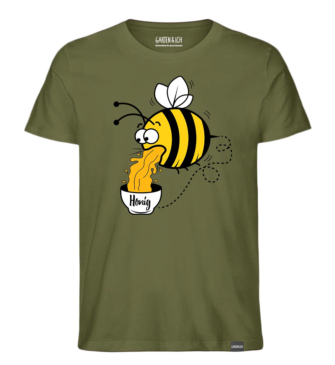 Dieses witzige Garten & Ich Herren-Shirt bringt garantiert gute Laune: Eine freche Cartoon-Biene füllt fleißig einen Honigtopf – perfekt für Imker, Gartenfreunde und alle, die humorvolle Naturmotive lieben.